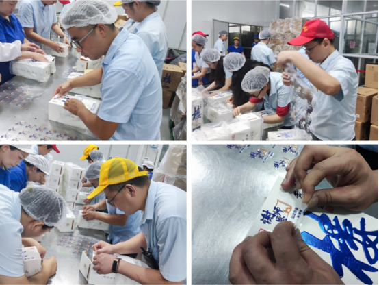 為確保樓20謝恩師定制產(chǎn)品順利生產(chǎn)上市,生產(chǎn)黨支部、財(cái)務(wù)審計(jì)黨支部響應(yīng)號(hào)召,充分發(fā)揮黨員先鋒模范作用,開展產(chǎn)品貼標(biāo)活動(dòng)。時(shí)間緊、任務(wù)重,黨員們?cè)谲囬g工作人員指導(dǎo)下有序進(jìn)行貼標(biāo),埋頭苦干、一絲不茍,與一線員工齊奮斗,本著不浪費(fèi)一張標(biāo),不貼花一個(gè)盒子原則,保質(zhì)保量完成任務(wù)。