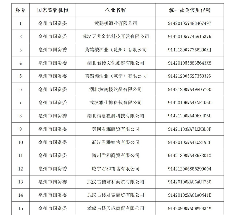 依據相關要求,現將黃鶴樓酒業有限公司出資企業名單進行公示,如有變化,將及時更新。企業信息如下: