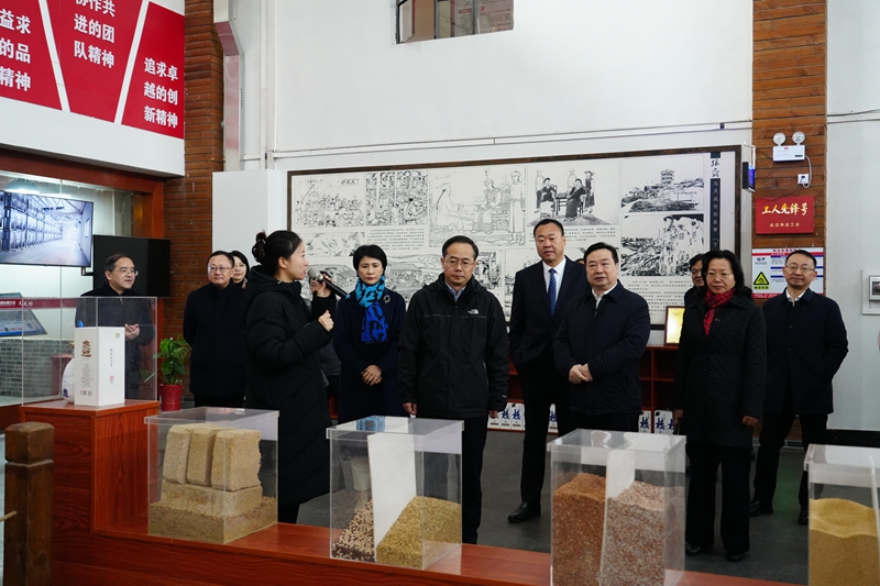 在天成坊釀造車間,吳朝安一行了解了黃鶴樓酒的釀造生產工藝,許鵬匯報了黃鶴樓酒的歷史文化與企業發展近況。他表示,近年來,黃鶴樓酒業高度重視產品升級與匠心釀造,希望市委市政府加大幫扶力度,助力中國名酒復興,助推武漢禮物發展。吳朝安表示,黃鶴樓酒作為湖北唯一中國名酒,要加深品牌宣傳工作,加實產品推廣力度,激發企業發展潛能;要堅持產品特色,立足資源優勢,打造更優產品,打響武漢名片。