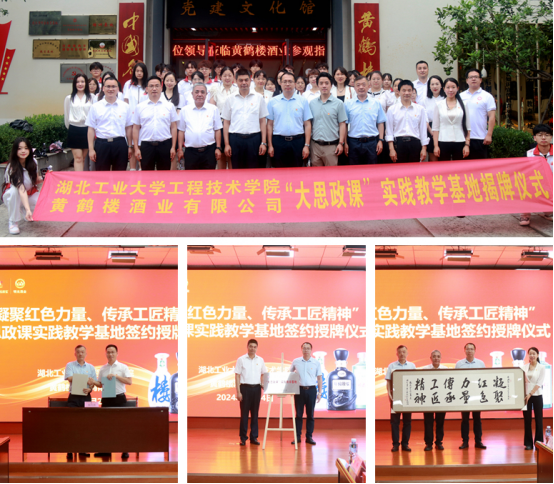 6月24日,湖北工業大學工程技術學院與黃鶴樓酒業舉行“大思政課”實踐教學基地簽約及授牌儀式。湖北工業大學工程技術學院黨委書記朱愛軍、副院長姜偉,黃鶴樓酒業黨委委員、技術質量中心總監李良,工會主席、黨工團中心總監張瑞,人力資源中心總監張佳出席活動。