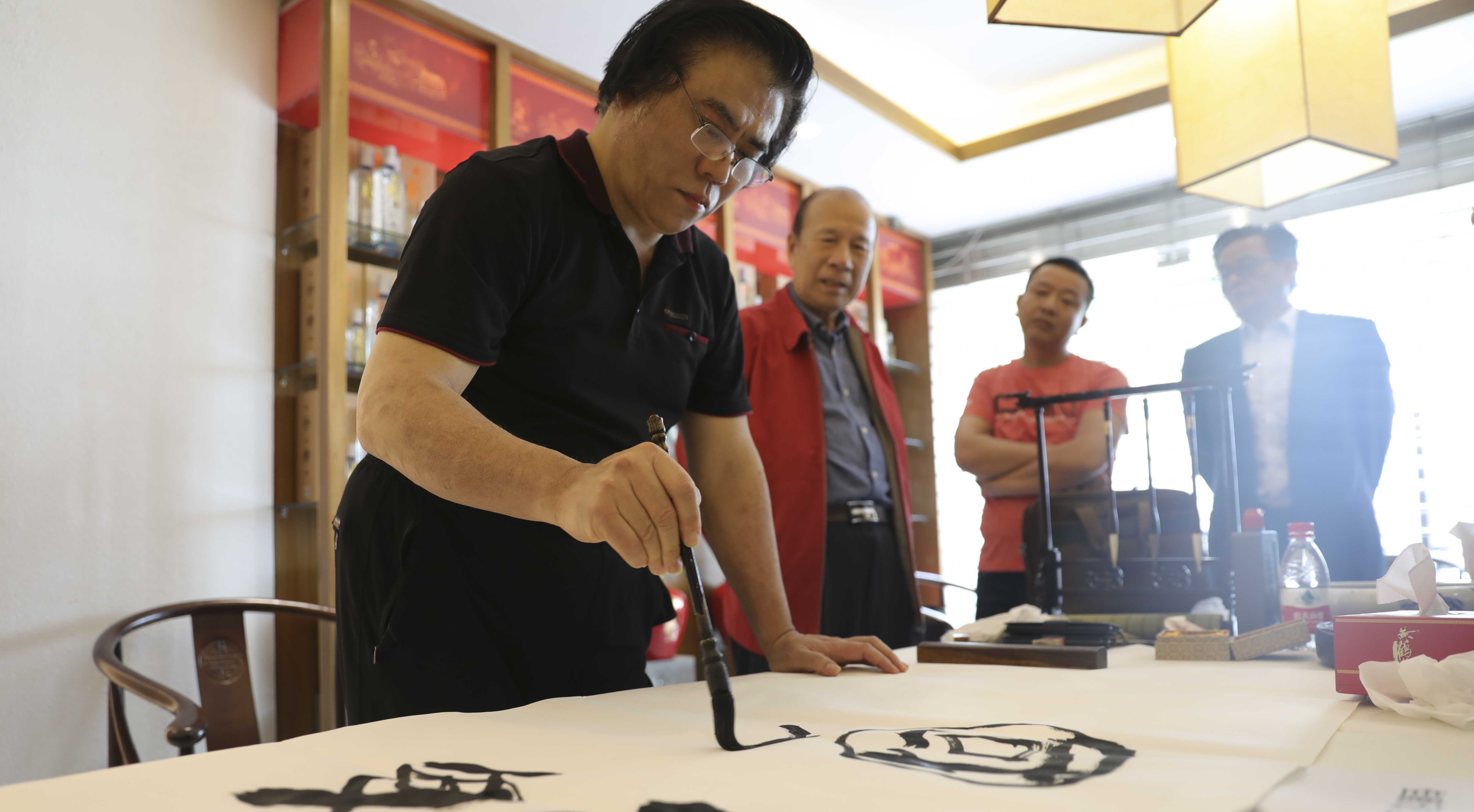 參觀結(jié)束后,作為香港文藝界的領(lǐng)軍人物,張孝勇?lián)]毫潑墨,向黃鶴樓酒敬贈了墨寶題詞。